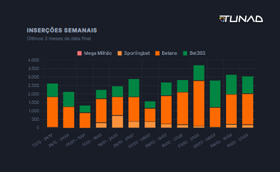 Exemplo de dados para visão estratégica. Inserções semanais de marcas de Apostas Esportivas. Fonte: Tunad.