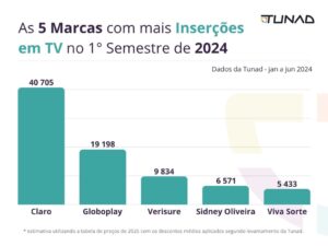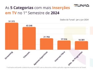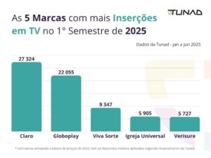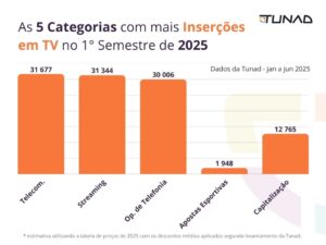 A Tunad, empresa especializada em inteligência de mídia, monitora diariamente as inserções publicitárias da TV aberta em São Paulo e da PayTV. Com base nesses dados, foi realizado um estudo comparando o volume de anúncios veiculados no primeiro semestre de 2025 em relação ao mesmo período do ano anterior, revelando as marcas e categorias mais presentes na TV.