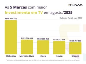 Em agosto, Globoplay manteve a liderança, destinando R$ 58,7 milhões à TV. Logo depois vieram Mercado Livre (R$ 25,0 mi), Claro (R$ 23,9 mi), Havan (R$ 22,7 mi) e Shopee (R$ 20,7 mi).