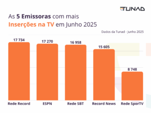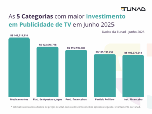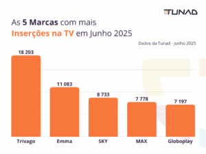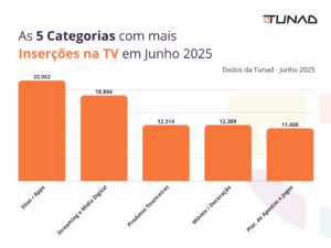 Mês a mês, a Tunad monitora as cinco marcas e categorias mais ativas na TV Linear — o “ao vivo”, com programação fixa, diferente das plataformas de streaming on-demand. A análise soma TV aberta e canais pagos, considerando veiculações publicitárias no formato de spots comerciais (anúncios gravados) e merchans (ações publicitárias inseridas dentro dos programas – entenda mais sobre o formato de merchans na TV aqui).