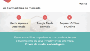 Os especialistas da Tunad, Ricardo Monteiro, Cesar Sponchiado e Alê Galliotti também chamaram atenção para as três armadilhas que travam o ROI das campanhas: medir apenas audiência, reagir tarde demais e tratar offline e online como universos separados. A proposta é superá-las com uma metodologia de cinco passos — monitorar, identificar, acionar, mensurar e otimizar — que conecta as duas frentes e transforma buscas em estratégia.