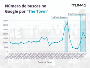 Nos 30 dias que antecederam o The Town, as buscas começaram em 10.564 registros e chegaram a uma média de 21.635 nos dias de festival — um crescimento de +105% em relação ao início do período.